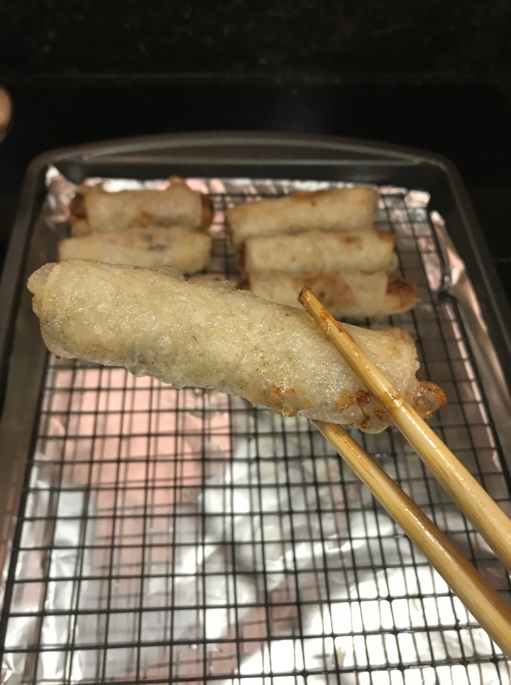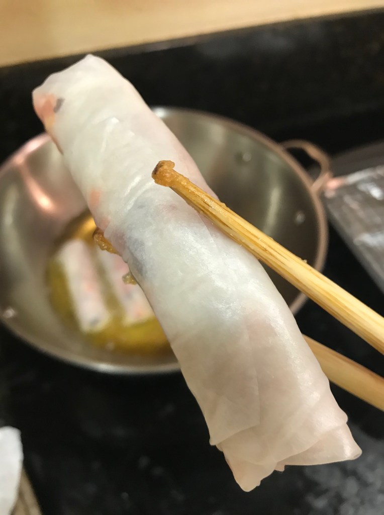 - Place rice paper rolls onto a tray lined with parchment paper and allow to air dry for at least 5-10 min. Important – do not fry rice papers when surface is still wet!