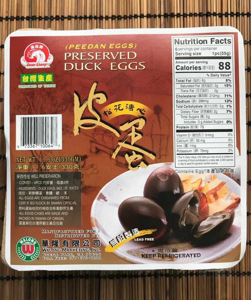 Century eggs are essentially duck eggs preserved for several weeks in a mixture of salt, quicklime, ash, clay, and rice hulls coating the exterior. This process makes the egg white turn a beautiful transparent black glassy appearance speckled with white snowflake-like patterns across the surface. Meanwhile, the yolk becomes a dark liquid jelly that’s grayish in color. The odor can have a strong sulfur smell but becomes quite mild once cooked.