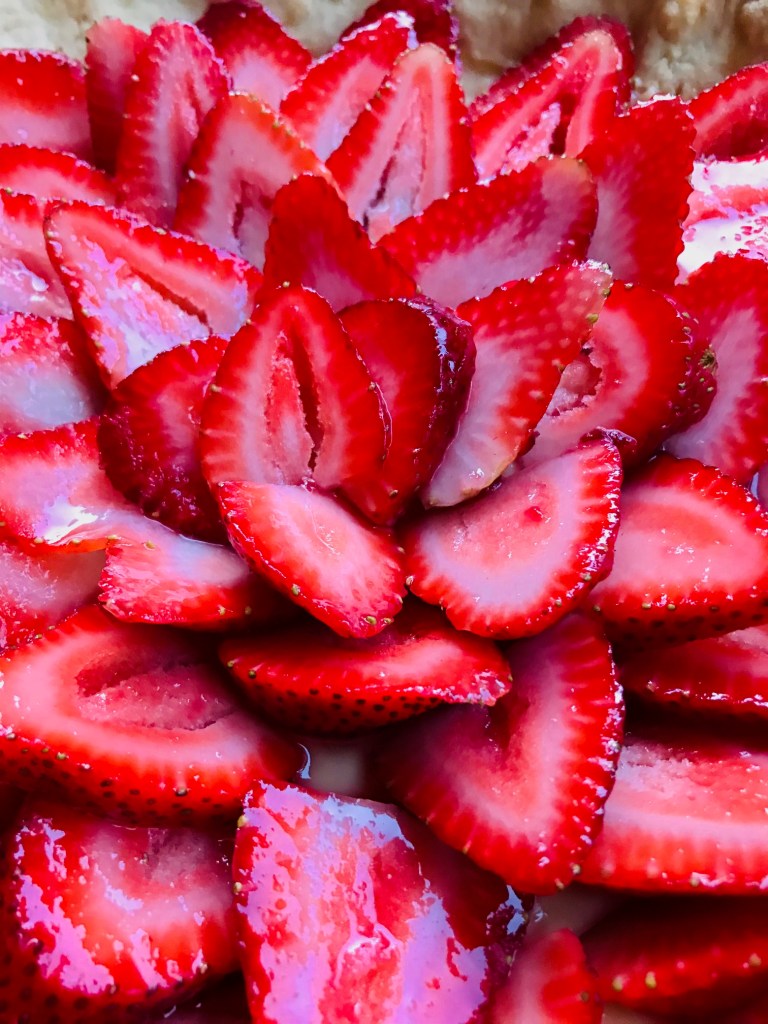 - To assemble the tart, spread the pastry cream into the pie crust and then arrange the sliced strawberries in a circular pattern. Using a pastry brush gently brush the strawberries with the fruit glaze.