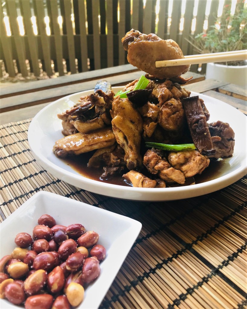 Now for this recipe I like to use a whole young chicken and have my husband do the dirty work and help chop it up into bite size pieces haha! Young chicken meat is sweet and tender and cooks quickly in the wok, but if you don’t have it on hand chicken thighs or legs cut into chunks work just as well. Another trick in Chinese cookery is to flavor the oil before browning your meat, so one key step here is to fry the aromatics, in this case the ginger and green onions, for a few minutes until browned and fragrant. The Shaoxing wine and hint of sesame oil at the end also gives this dish a nice added savoriness. After braising the chicken with the mushrooms until the sauce becomes thick and syrupy it’s ready to eat!