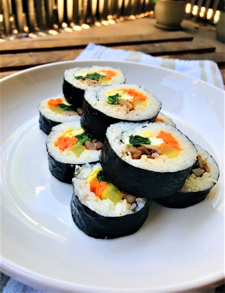 I love Korean food and gimbap also known as Korean seaweed rice rolls is one of my favorite things to munch on! It looks very similar to Japanese sushi but it’s filled instead with delicious cooked vegetables and marinated meats to create an all in one compact balanced meal! Best of all it’s simple to make and you can put almost anything you like in it.