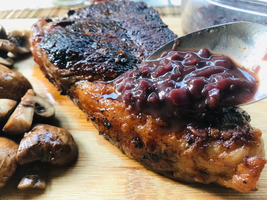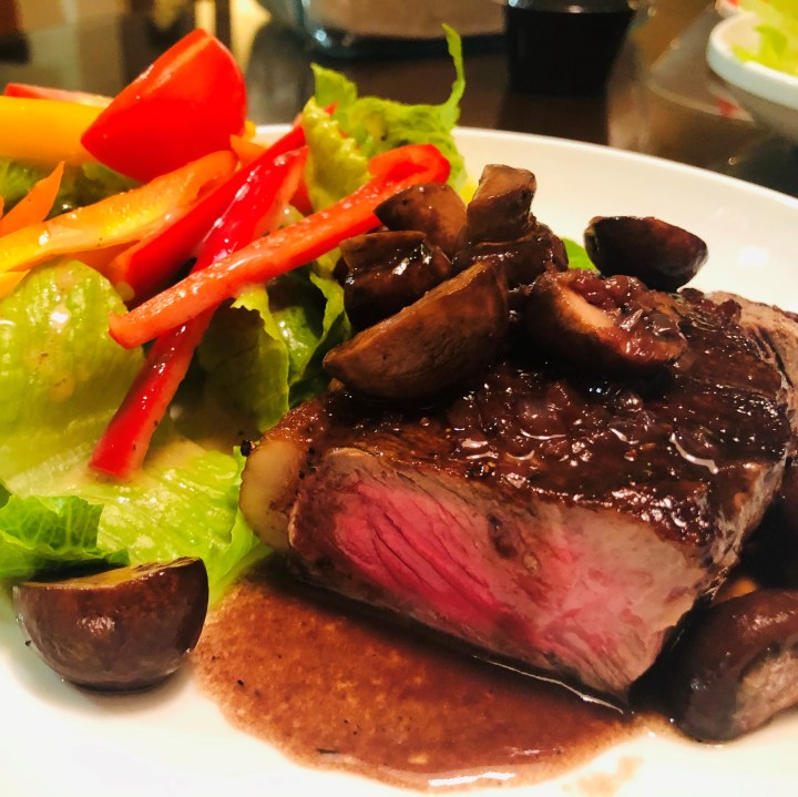 - Serve the steaks with shallot red wine reduction and sauteed mushrooms. Enjoy!
