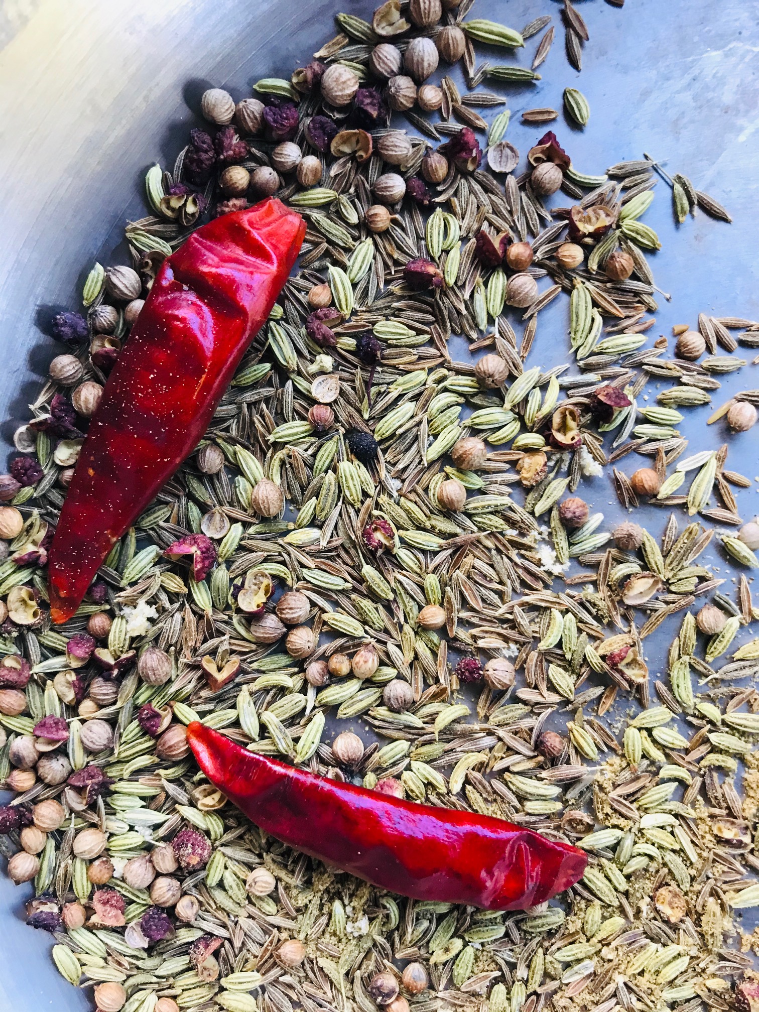 - Heat a pan on lo heat and toast the cumin seeds, coriander seeds, Sichuan peppercorns, sesame seeds, fennel seeds, and salt for 1-2 min until fragrant. Place into a spice blender and grind until a coarse powder.