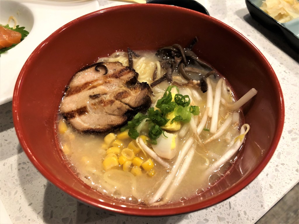 So after all those goodies, we were given a hand roll stuffed with spicy tuna…not bad but I like the oshi better. And to round things off the last main course was a nice bowl of udon noodle soup, a tasty sweet and salty seaweed broth with great bouncy noodles. Now we were hungry that night and I had a craving for ramen so I also ordered their Tonkotsu Ramen which had a light broth and not bad to satisfy your desire for warm comfort food.