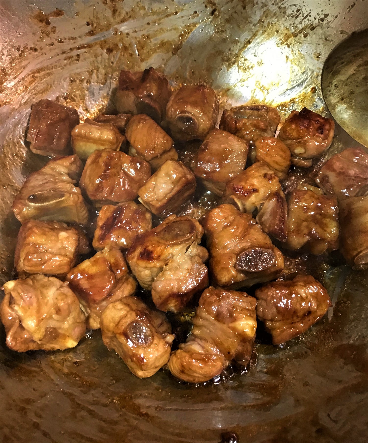 - Add in your pork rib pieces and coat them with the sugar oil mixture constantly. Continue to cook the ribs until the surface becomes a caramelized brown color.
