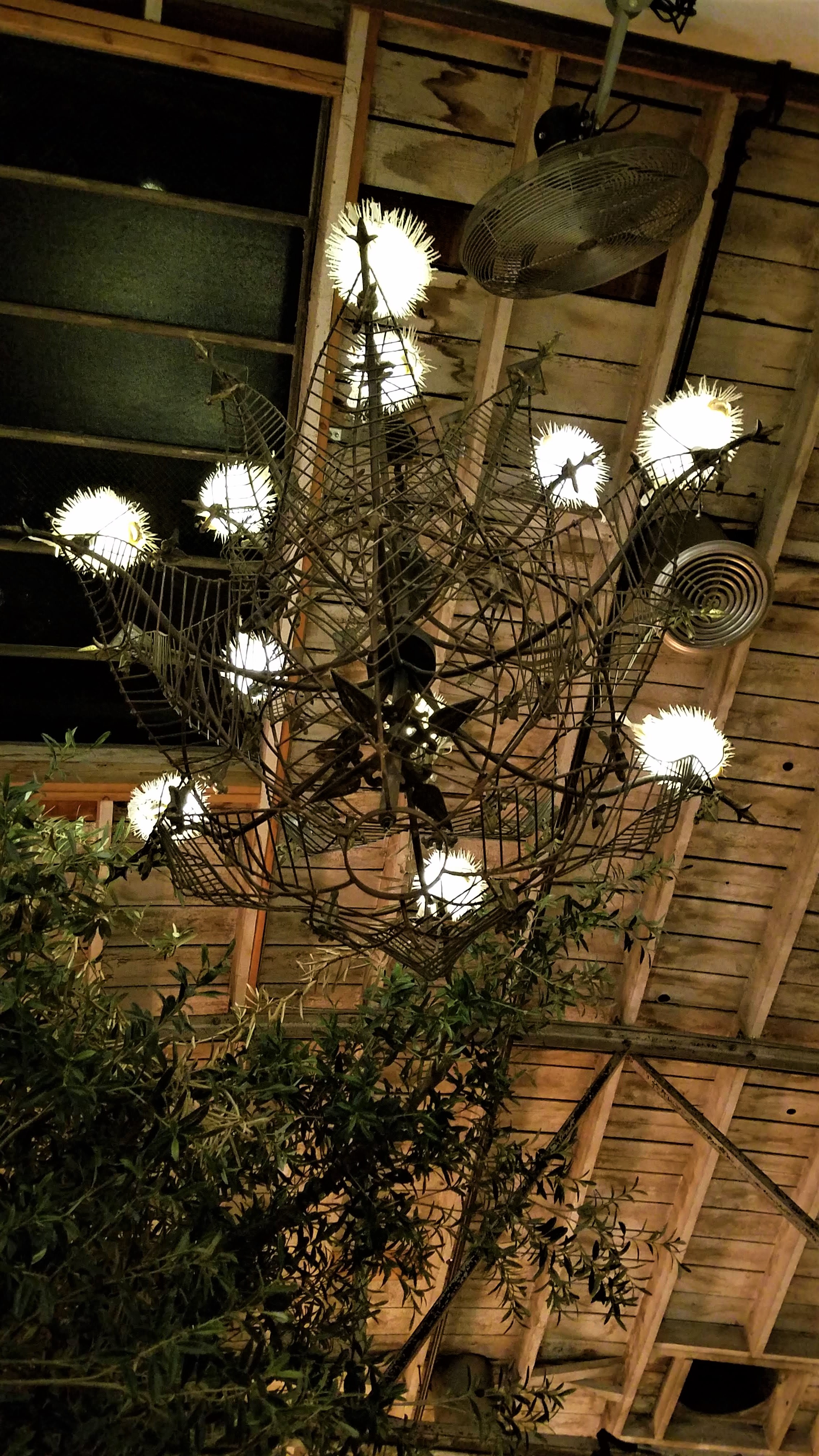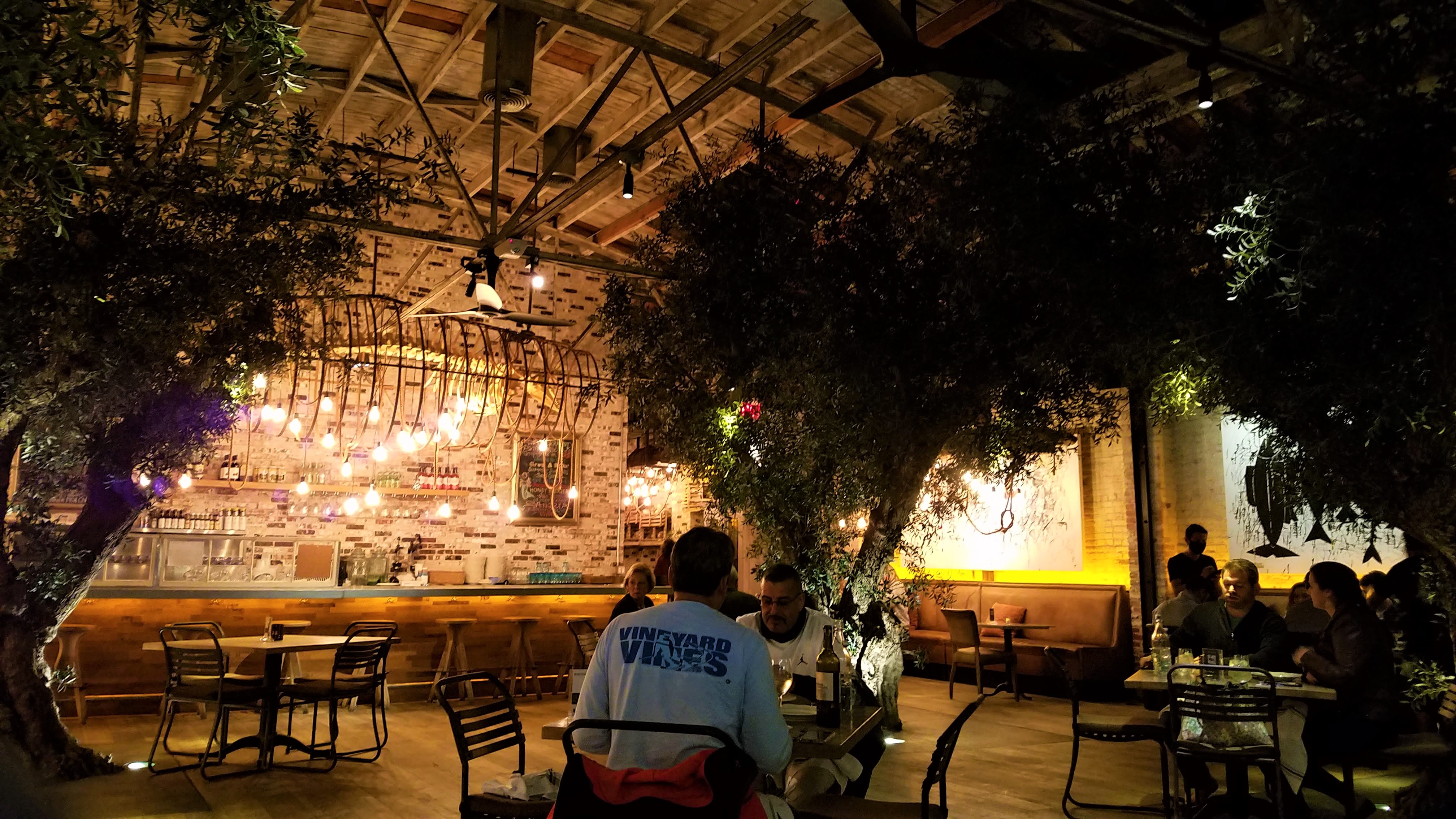 The host took us to the back dining area where it opens up into a large space filled with more olive trees and a really cool center piece light fixture above the bar area that is an artistic mix of metal hoops and rope surrounding a suspended dolphin skeleton I think? There are also chandeliers scattered around where the bulbs are made of puffer fish, how neat! The warm lighting in this place is very inviting and immediately relaxes you and takes you into a new world!