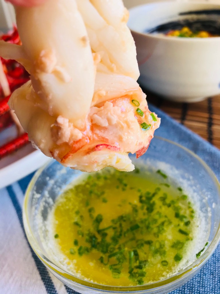 - While the lobsters are cooking, melt butter under low heat in a sauce pan and add in 2 garlic cloves crushed. Cook the butter and garlic on low for 5 min until the milk solids begin to separate out. Carefully remove the milk solids and mix in the salt to taste. Transfer the clarified butter to a dipping bowl and sprinkle with chopped chives.