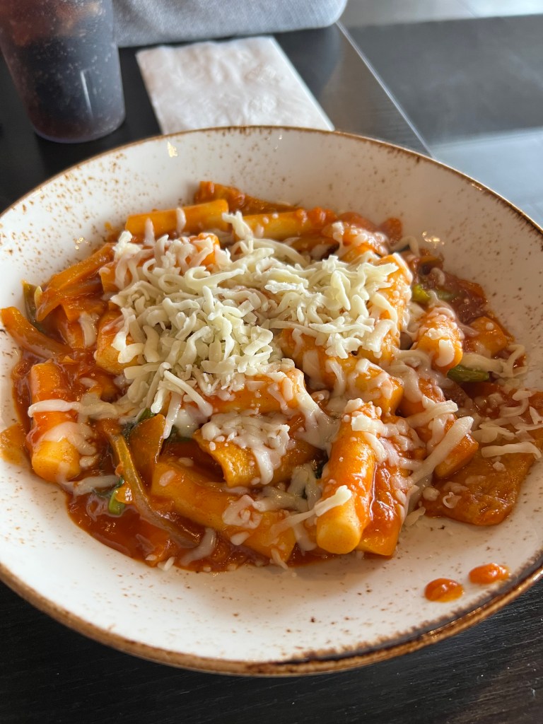 For the side dish, we ordered a classic Korean snack food called tteokbokki popular among younger generations. For those of you new to this dish, it’s made up of chewy rice cakes, slices of fish cake, some vegetables, and sometimes ramen stewed in a spicy gochujang (Korean fermented chili paste) sauce.